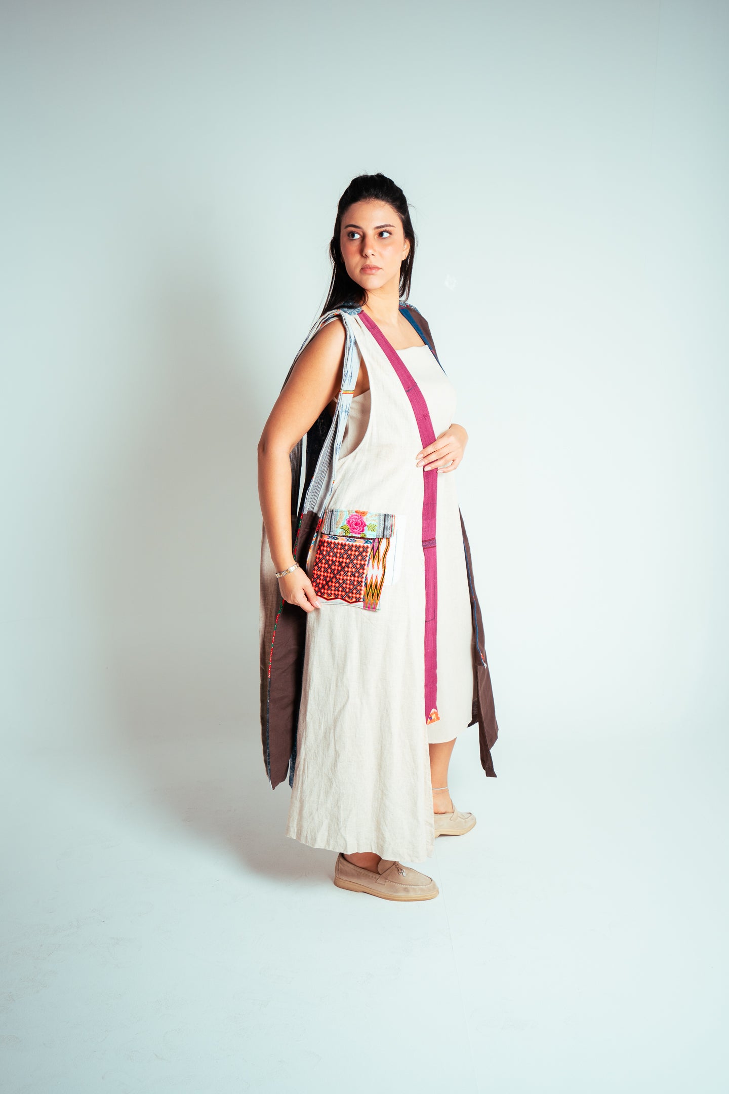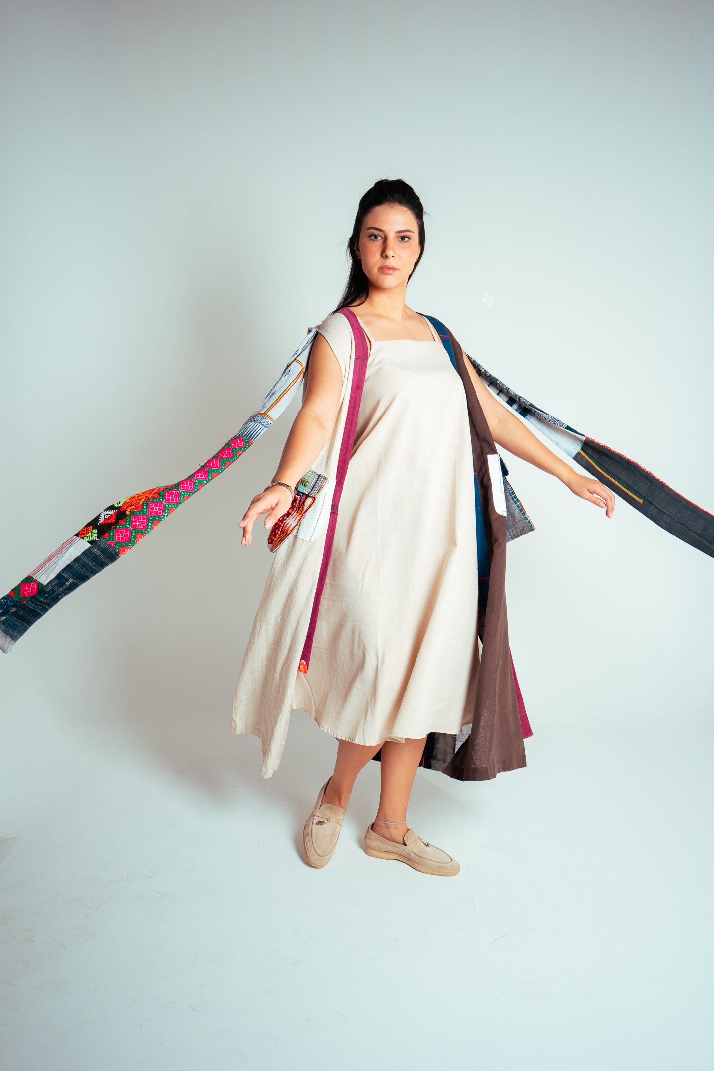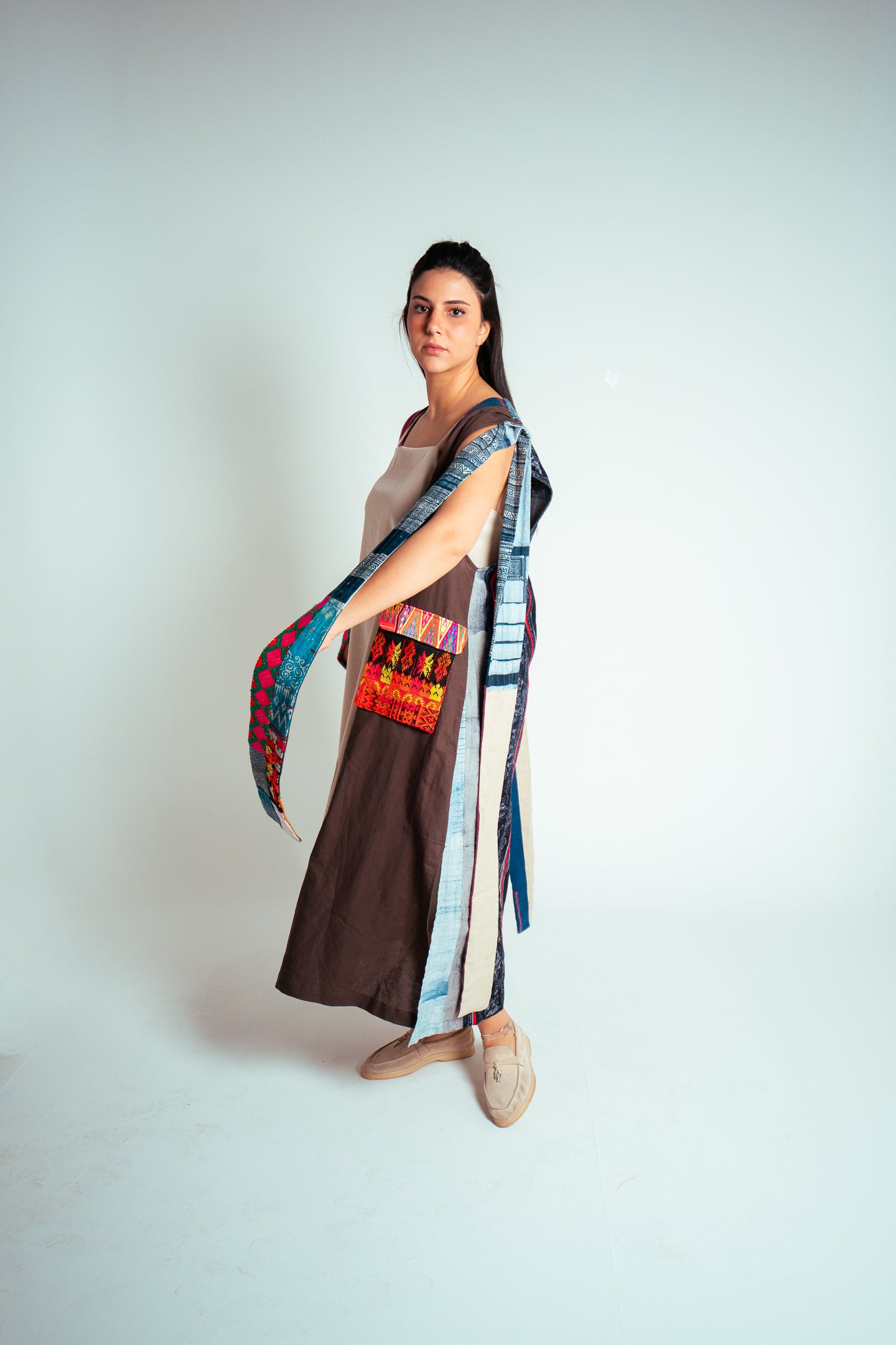 ليه طويل بوصلاة قماش مفتوحه وجيوب مطرزه مع فستان لنن ناعم .