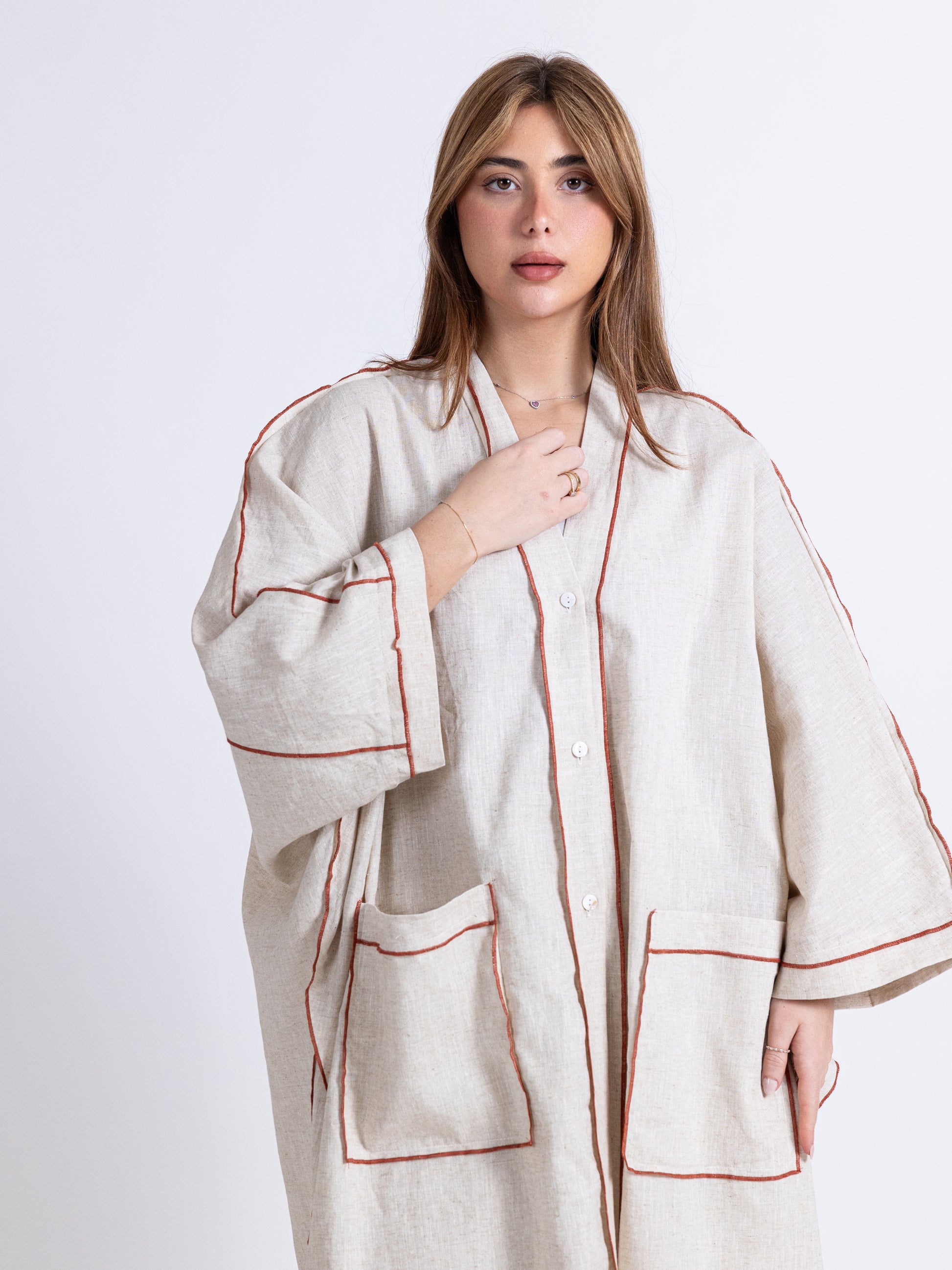 (Sold Out) Two pieces linen set. Long Bishet with buttons and pants set