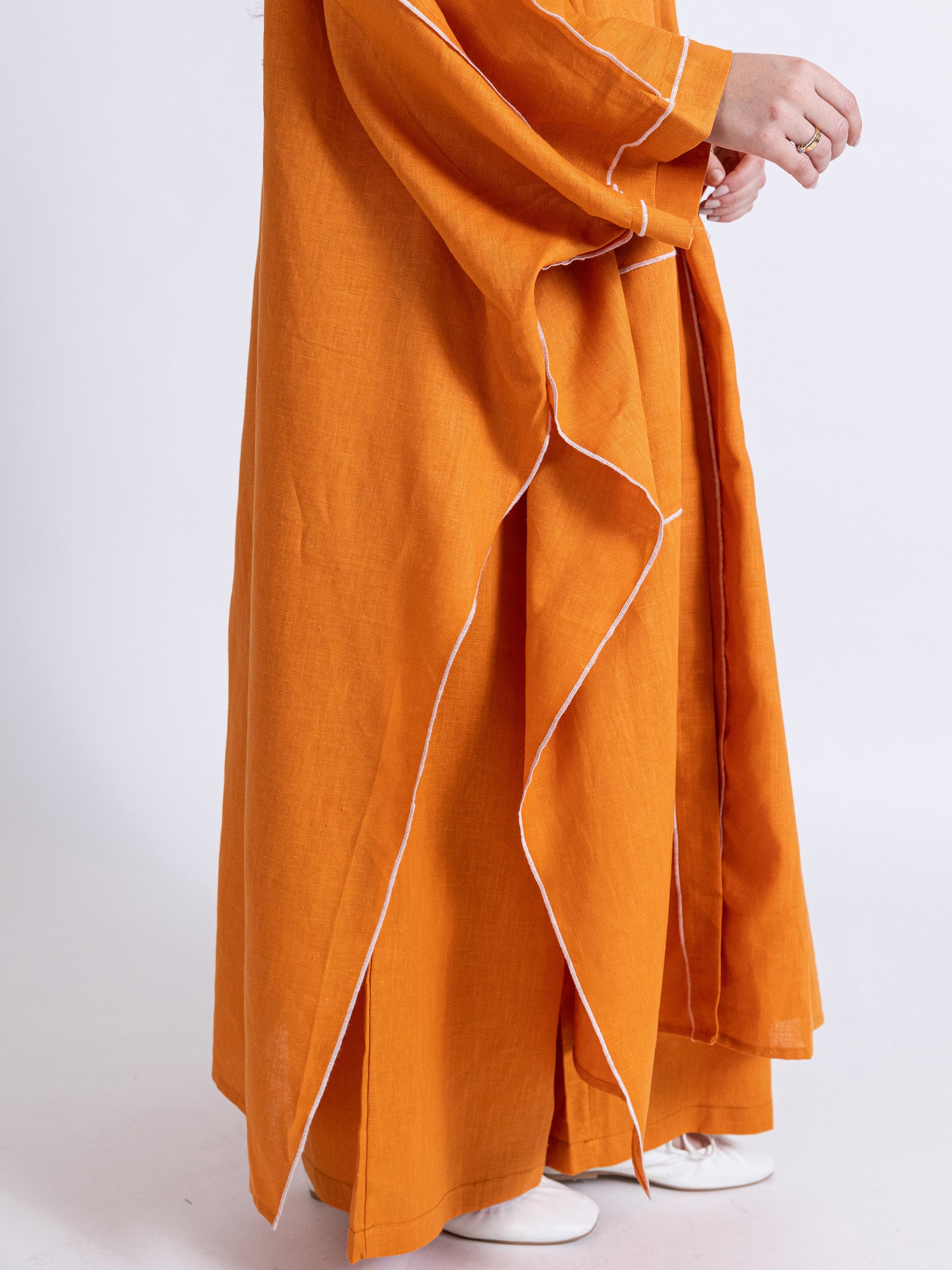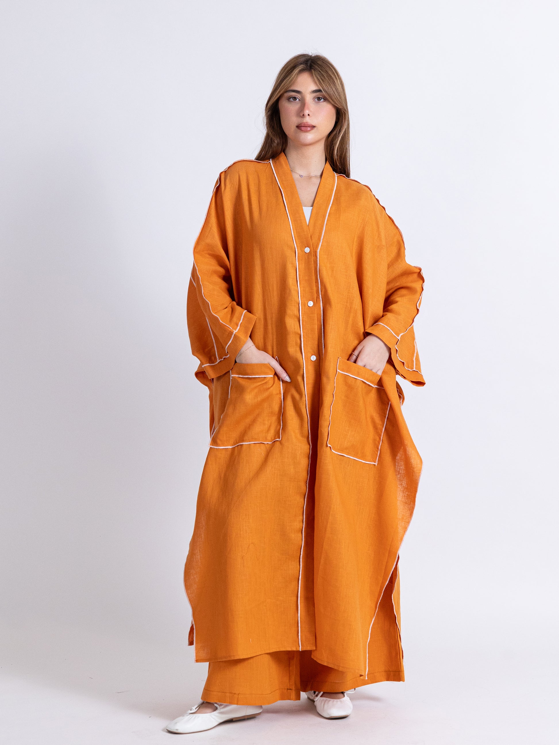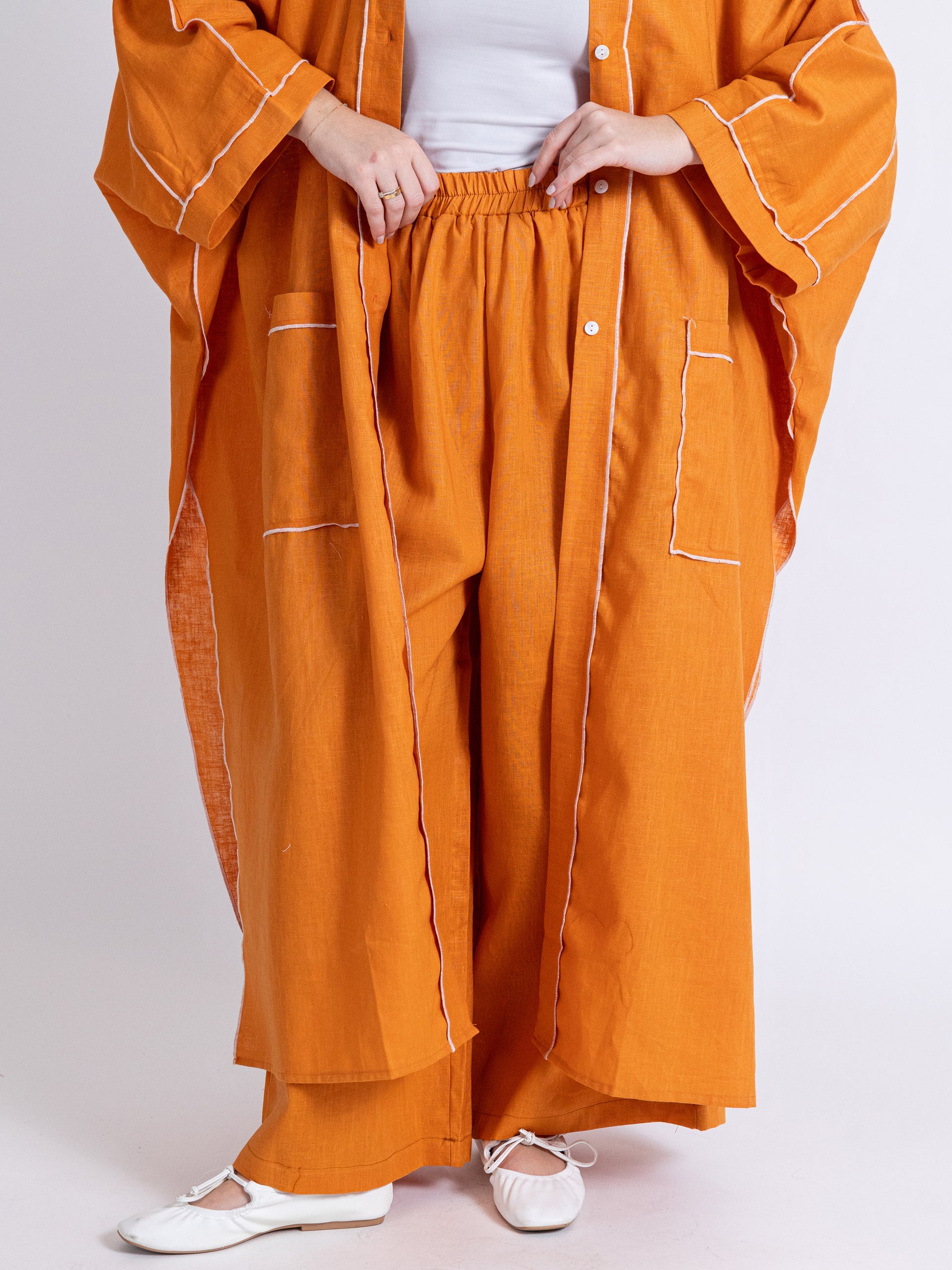 Two pieces orange linen set: long bishet with buttons and pants.