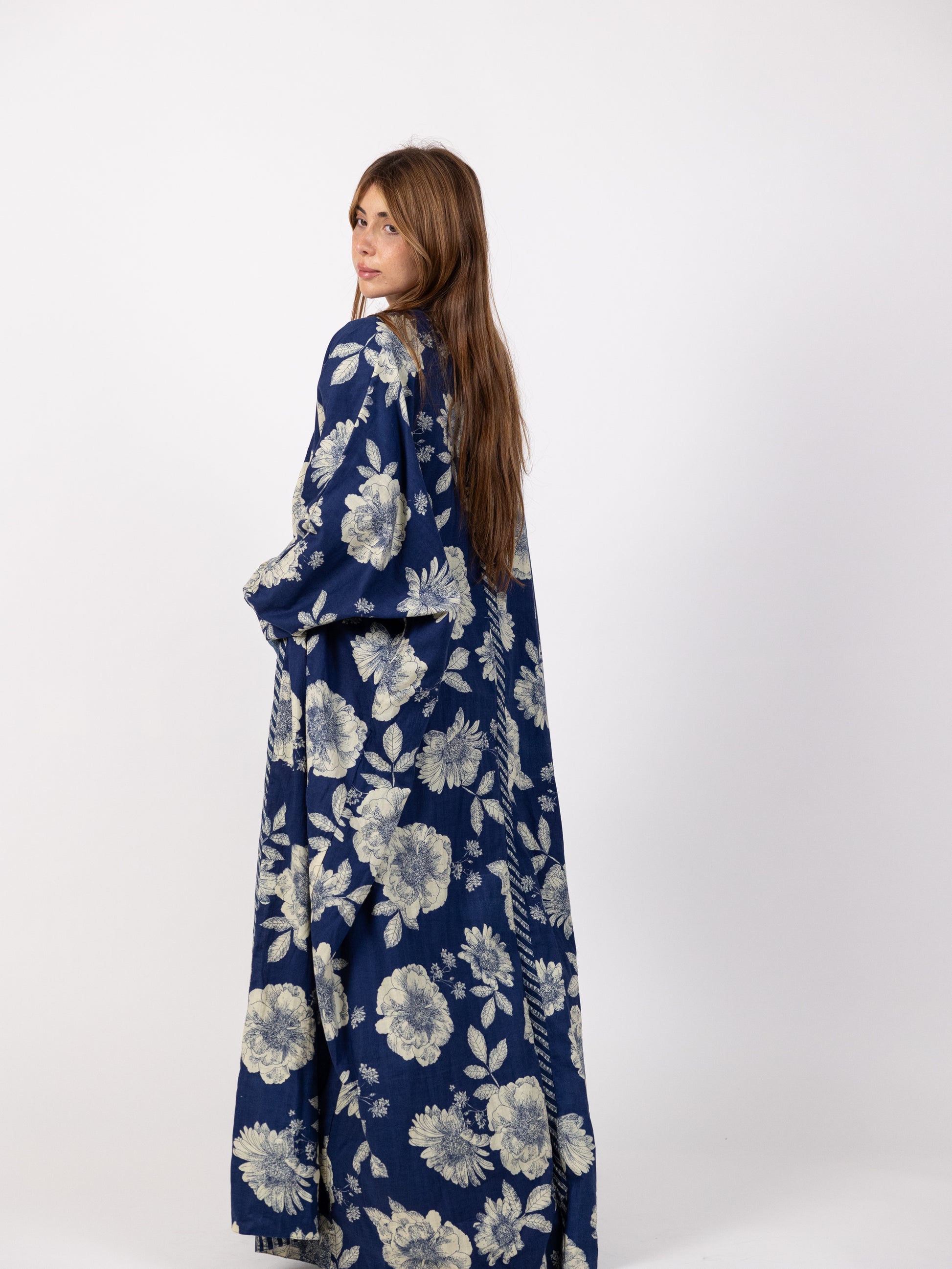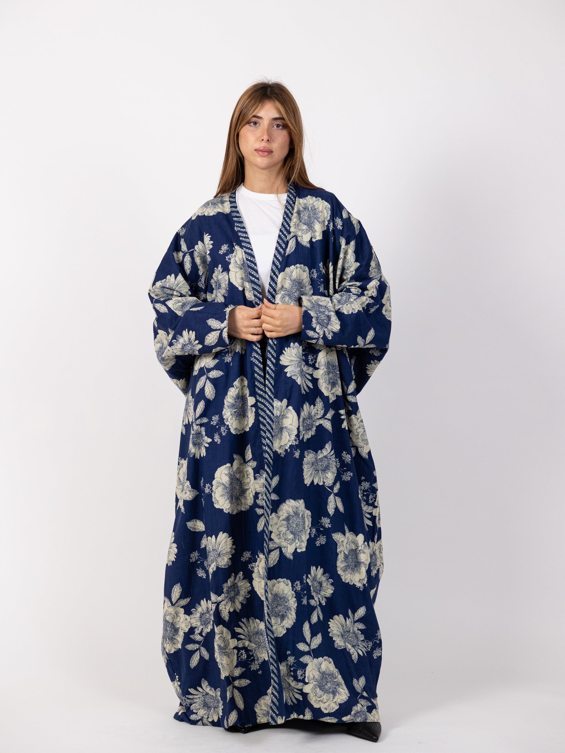 2 sides dark blue bishet - one side with stripes and another side with big floral pattern
