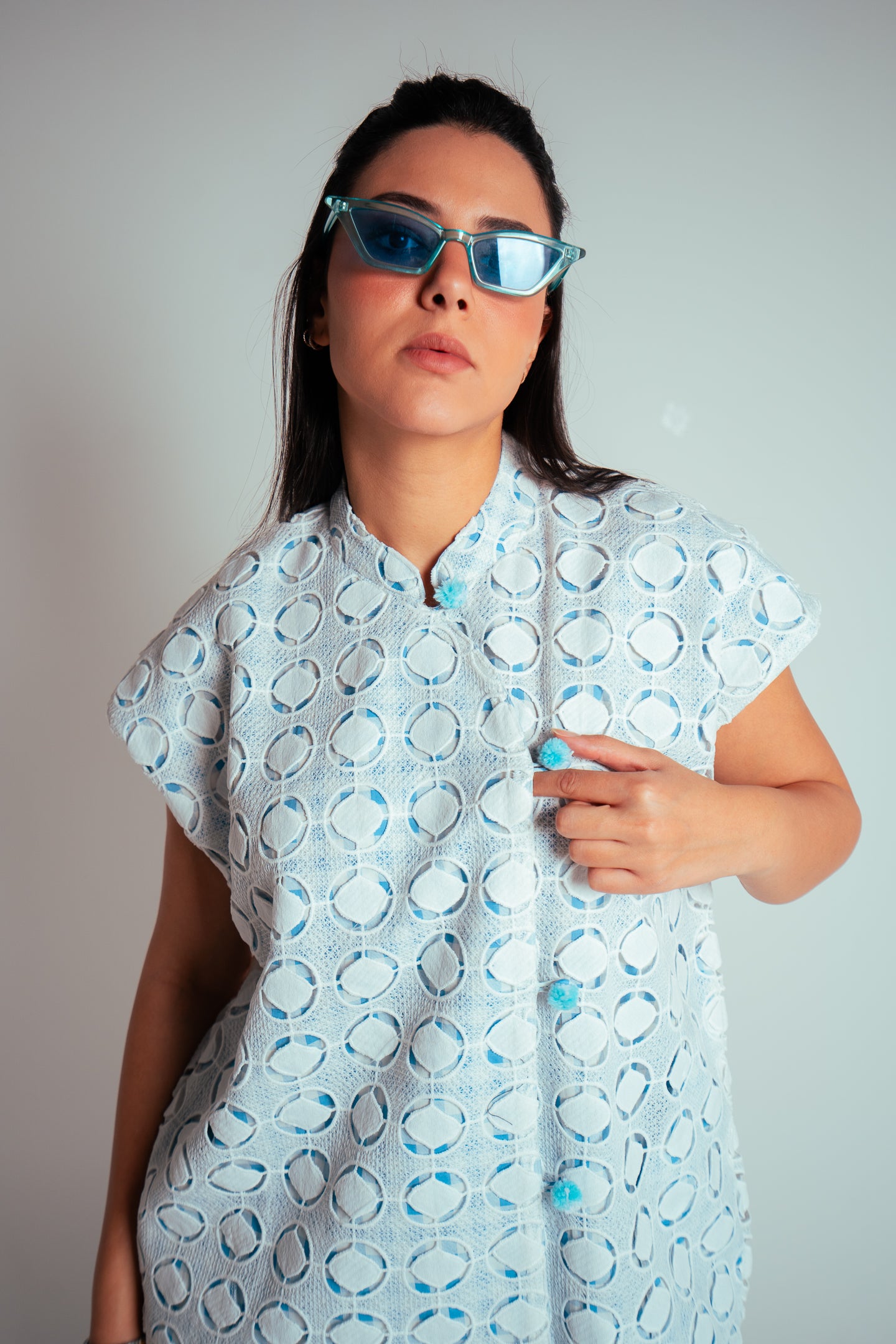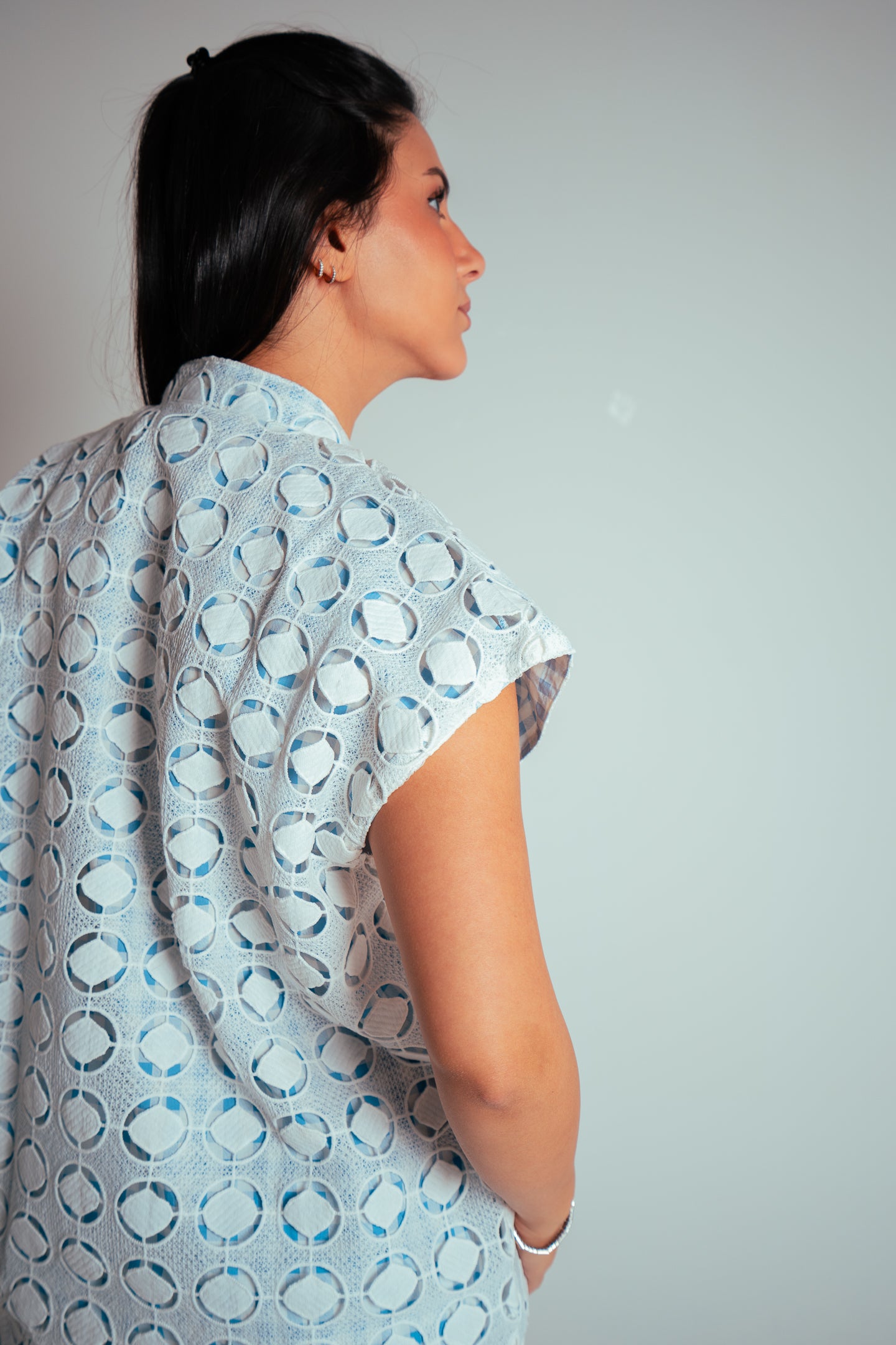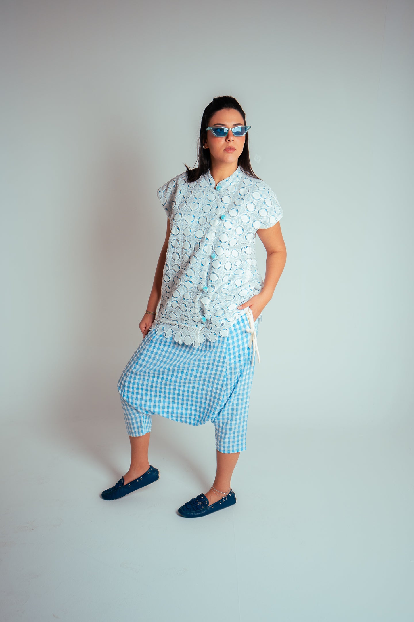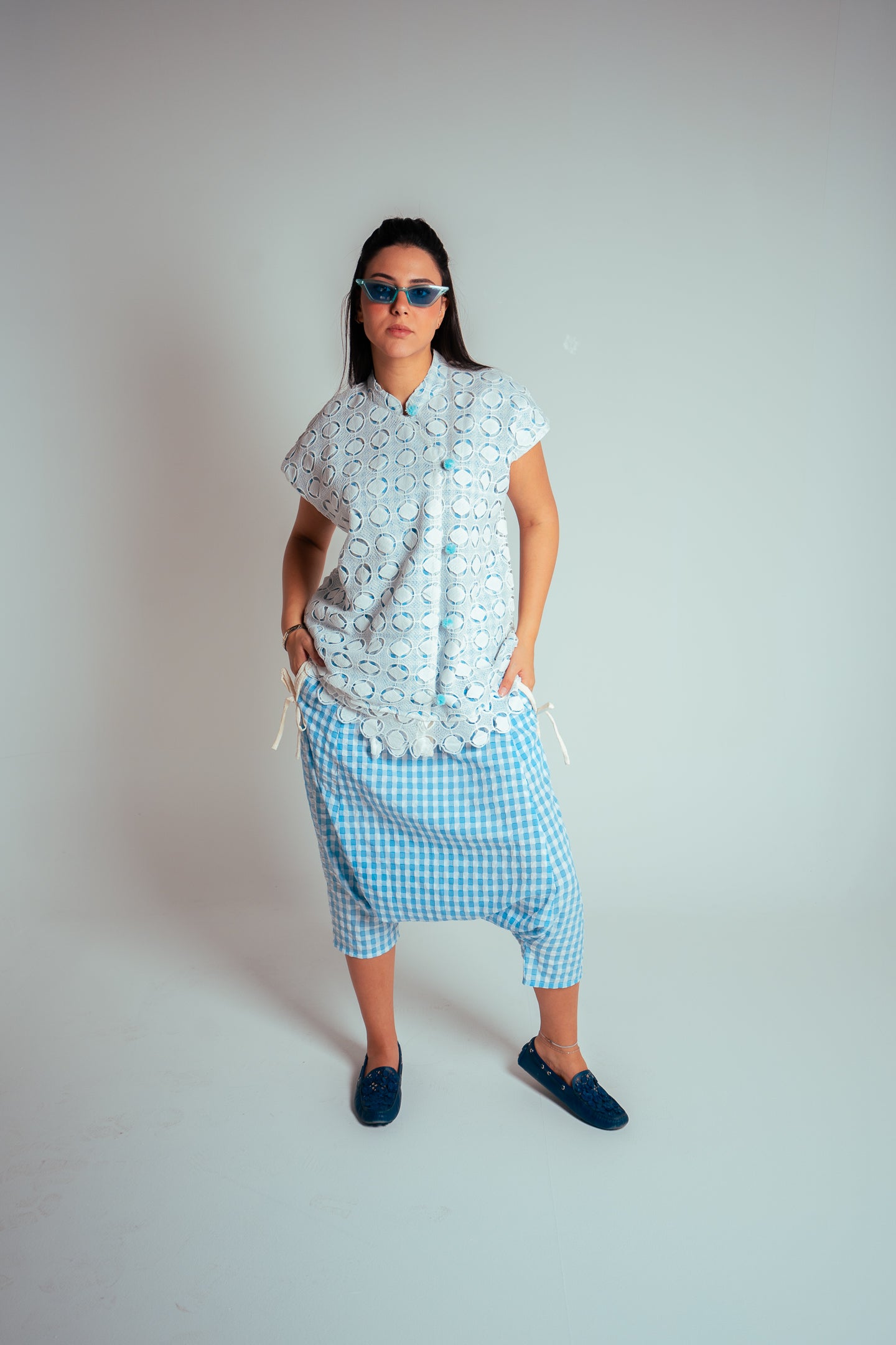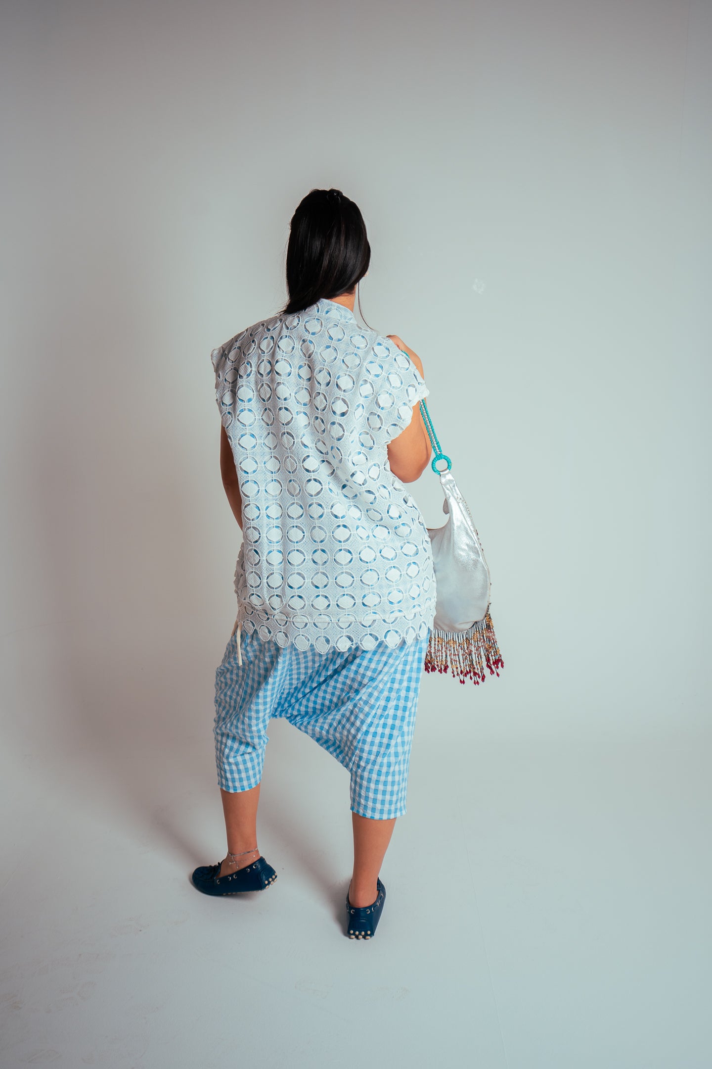 Two-piece cotton set with a blue plaid sharwl and a short-sleeve lace vest.