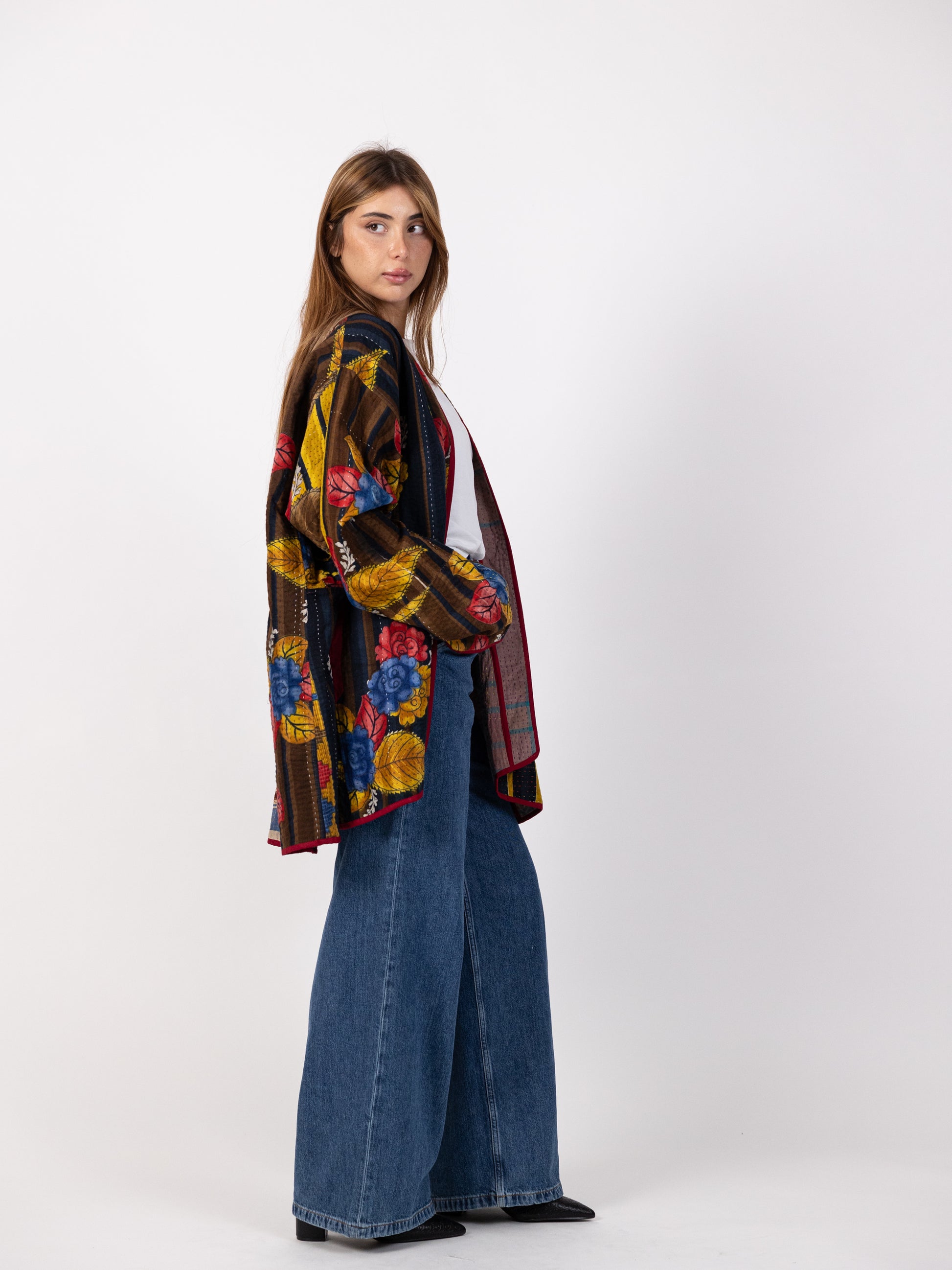 Handmade midi double side jacket - One sided mixed shades of red and another side black with different colorful flowers